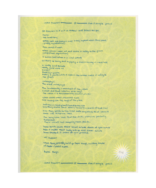An illustration of another world, a tender of the flock, a world of botanical fishlike fantasy and Damascene motif. And a poem written during the artist’s residency at Directangle Press about joy. There was lots of it there.