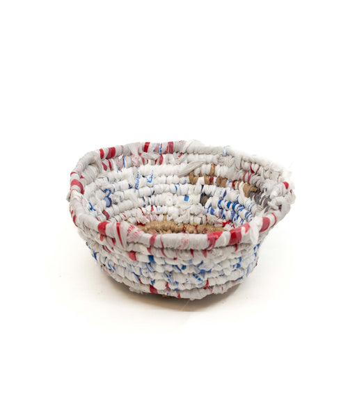 Dimension: Range in 3-9” diameter x 2” high Material: Hand made Coil basket from Upcycled Plastic bags with cover. Grandpa Dirt(McKinley Park)